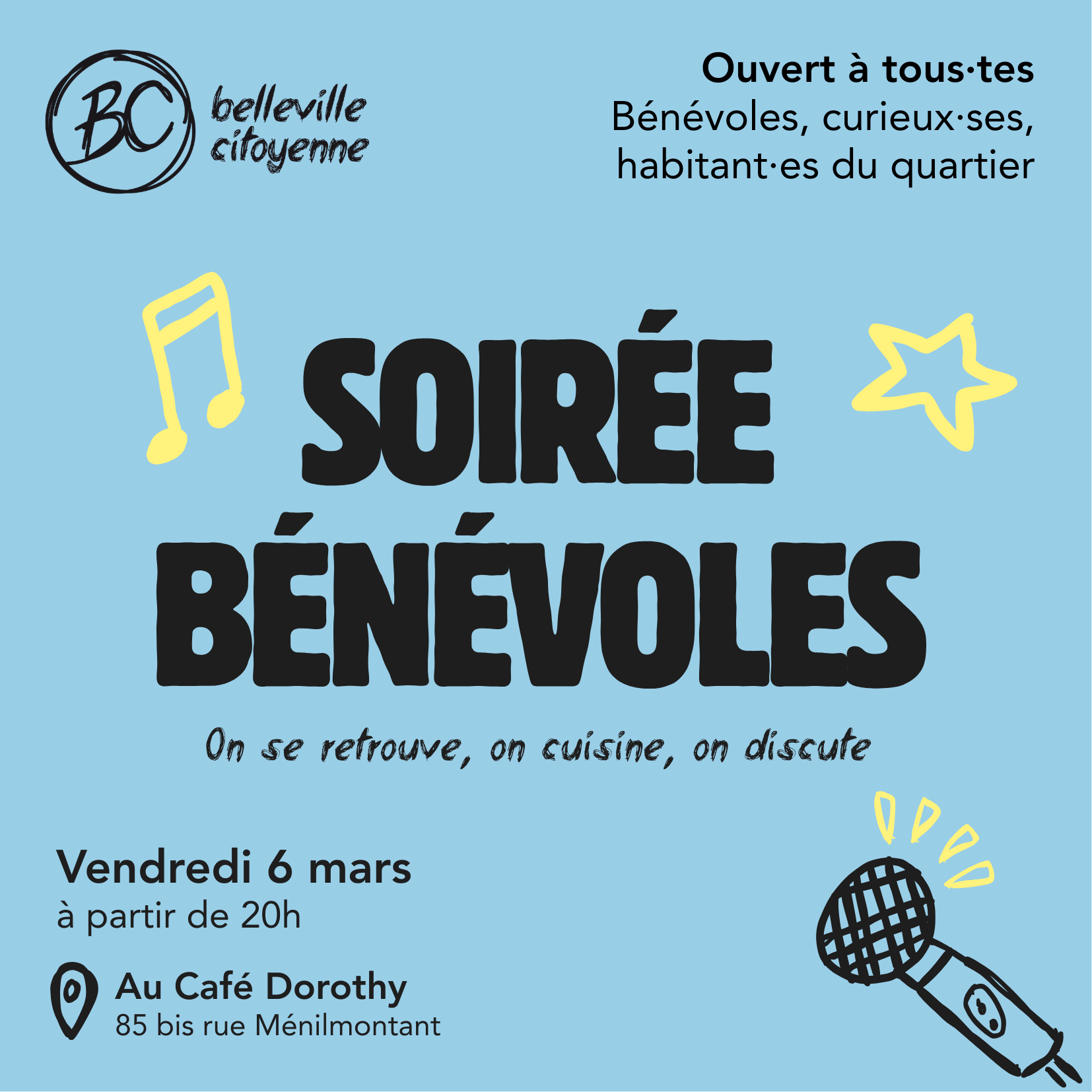 Belleville Citoyenne vous invite à sa Soirée Bénévoles le vendredi 6 mars de 20h à 22h au Café Dorothy (85 bis rue Ménilmontant).